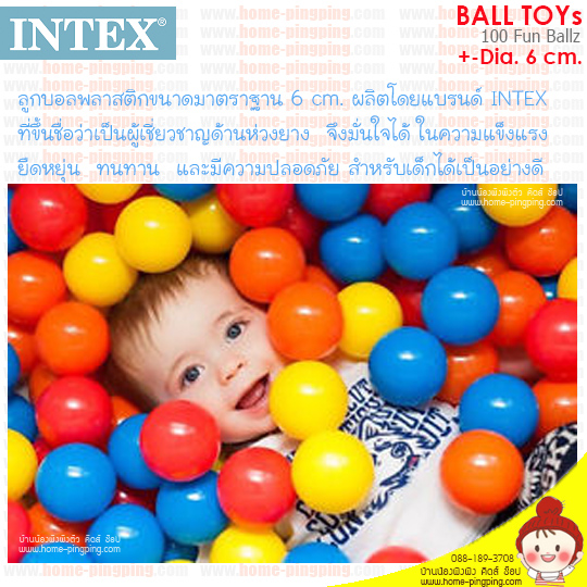 ลูกบอลหลากสี จากแบรนด์ชั้นนำอย่าง Intex ผลิตจากวัสดุปลอดสารพิษ เนื้อหนา ไม่รั่วซึมง่าย มีสีสรรสดใส คละมาหลากหลายสี บรรจุมาในแพ็คเกจกระเป๋าสวยงาม มีตราประทับแบรนด์ Intex ทุกลูก สามารถนำไปใส่ในบ่อบอล หรือสระน้ำก็ได้ เพิ่มความสนุกสนานให้เด็กๆได้เป็นอย่างดี