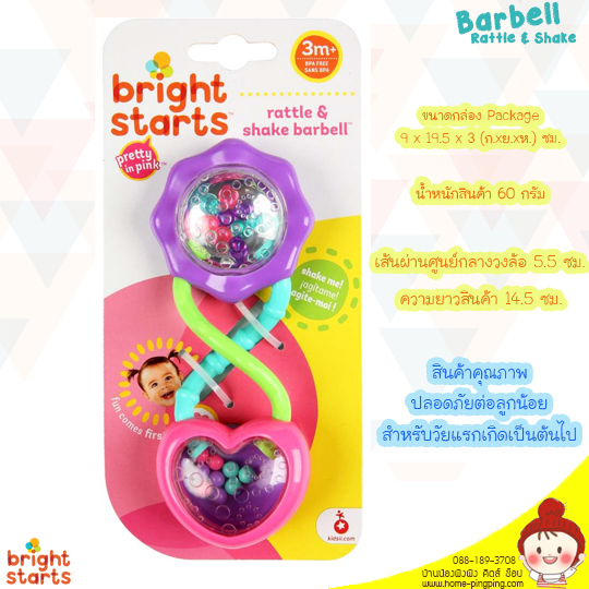 1. ยี่ห้อ Bright Starts สินค้านำเข้า แบรนด์จากประเทศอเมริกา2. น้ำหนักพร้อมแพ๊คเกจ 100 กรัม3. ขนาดบรรจุ พร้อมแพ๊คเกจ 9x19.5x3 cm.4. ลักษณะเป็นพลาสติก มีกระจกเล็กๆและลูกปัดหลากสี5. ของเล่นเด็กจะมีสี และ ผิวสัมผัสที่ต่างๆกันในทุกๆจุด6. ทำความสะอาดได้ทุกๆเวลา