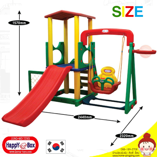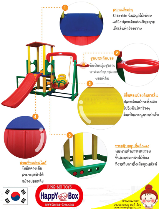 2. นำเข้าผ่านตัวแทนจำหน่าย ของศูนย์ในประเทศไทย3. สไลด์ สามารถปรับความสูง มุมลาดเอียงของสไลด์ได้ ตามวัยของเด็ก4. สไลด์ สามารถปรับความสูง ได้ 2 ระดับ5. แป้นบาส พร้อมลูกบาส (ไม่มีตาข่าย) สำหรับเล่นเกมส์ชูตบาส ประลองความแม่น6. โกล์พร้อมตาข่าย สำหรับเล่นบอลได้ + ชิงช้าเชือก + หลังคาทรงสูง