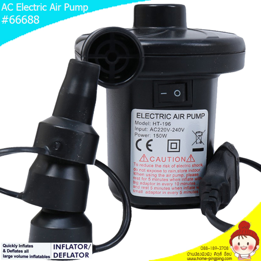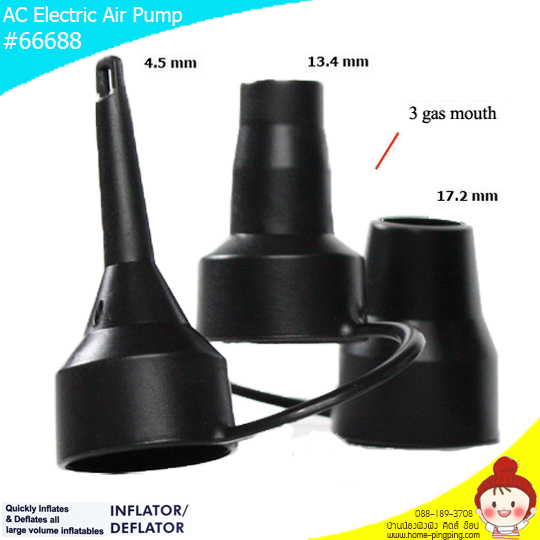ที่สูบลมไฟฟ้า  สำหรับระบบไฟบ้าน AC Electric Air Pump ยี่ห้อ Suoka รุ่นพิเศษ 66688 เป็นเครื่องสูบลมไฟฟ้าขนาดเล็กกะทัดลัด จับถนัดมือ จะช่วยผ่อนแรงในการสูบลมและช่วยลดเวลาลงไปได้ สามารถพกพาไปใช้งานได้ทุกที่ โดยตัวเครื่องมาพร้อมกับหัวต่อสูบลม 3 ขนาด คือ 4.5 mm. , 13.4 mm. และ 17.2 mm. ซึ่งปลั๊กเสียบเป็นชนิดมาตราฐานแบบแท่งยาว สามารถใช้เสียบกับไฟบ้านได้ค่ะ